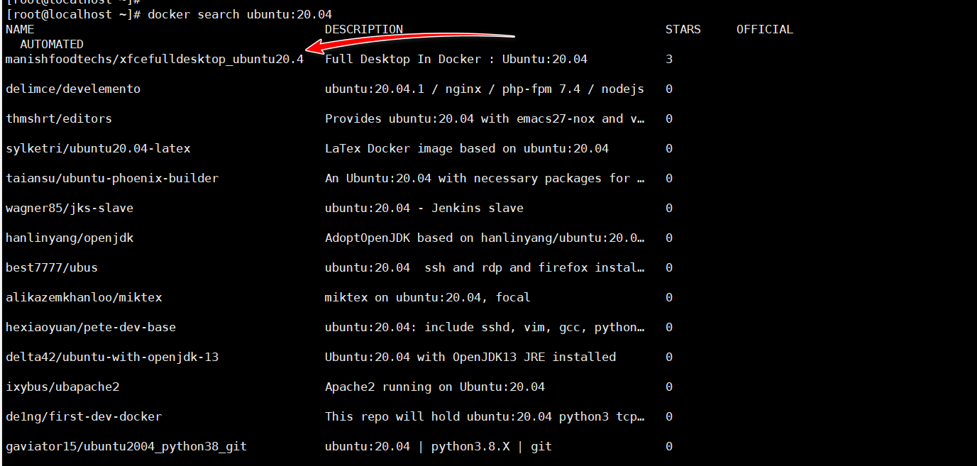 docker 搜索 ubuntu 镜像: docker search ubuntu:20.04