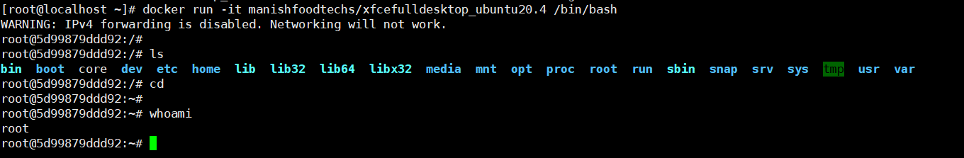 我们直接运行容器就行,进入容器的命令行docker run -it manishfoodtechs/xfcefulldesktop_ubuntu20.4 /bin/bash